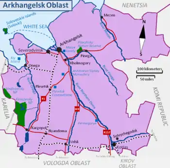 Arkhangelsk Oblast is a region in northwestern Russia, which borders Karelia to the west, the White Sea to the north, Nenetsia to the northeast, Komi Republic to the east, Kirov Oblast to the southeast, and Vologda Oblast to the south.