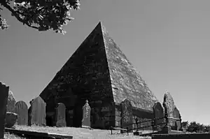 - π The Pyramid is within the old graveyard of Kilbride. It's a mausoleum built in 1785 for the 1st Viscount of Wicklow, a sturdy granite structure 33 feet high, 27 feet square and with 33 burial niches - these numbers (and the pyramid itself) are significant in Masonic lore. The last burial was in 1823. Pity about the M11 traffic thundering past.