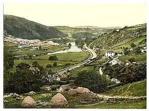 - π Aughrim is another picturesque village and scenic valley further west: you might come this way on the road to Tullow. The village is all built of local granite in a pleasing unity of style. Note this is not the site of the 1691 Battle of Aughrim that finished off the Jacobites: that was fought in County Galway.