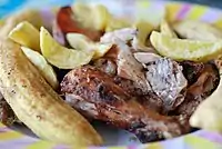 - π Kiti Moto, Makao Mapya Neighborhood (Taxi would be best: Tsh 3,000 [no more than 5,000] from the main bus station and Tsh 5,000 [no more than 10,000 from the city center]. Upstairs, second floor, inside Seuri Guesti [Guesthouse] right next door to Premier Palace Hotel [not The Palace Hotel in a different part of Arusha])). Lunch and dinner until about 9 or 10PM, 7 days a week. This restaurant is dedicated to serving only pork, which is not common in East Africa. The main carbohydrate is ugali (maize meal, not wet). There are also french fries (called "chips" in East Africa) or chipati (like a crepe) most of the time. Local (not tourist) prices here: Tsh 10,000 to 20,000 for two people.