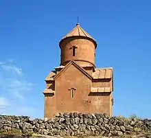- π Karmravor Church (Surb Astvatsatsin), 30 Abovyan str. (from the river, take the Karmravor road across the Ashtarak Bridge and follow the road up the hill until it reaches the walled church to the right; there is a large cemetery further east). The church was built in the mid-7th century and has been preserved without significant alterations. It features a single reddish clay tile domed roof (hence the name Tsiranavor, which means "reddish"). There are ancient khachkars around the church, and a stone gates with preserved engravings. It is a small church but quite interesting.