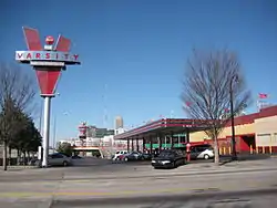 - π The Varsity, 61 North Ave (at Spring St), β +1 404-881-1706. Su-Th 10AM-11:30PM, F Sa 10AM-12:30AM. As the world's largest drive-in restaurant, to some people the Varsity is the last bastion of chili cheese dogs and onion rings, staying true to their heritage with their brusque "What'll ya have?" greeting. To others, it's a overrated place that serves greasy, heartburn-inducing food on a dodgy street corner troubled by thugs and panhandlers. But everyone agrees that the F.O. (Frosted Orange, a sort of orange creamsicle slushie) is unbeatable.