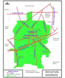 Decatur is accessible from Atlanta via Ponce de Leon Avenue, which is a direct route, but is a slow-moving surface street with many lights. It is also accessible from the Perimeter (I-285) via several exits, and indirectly via I-20. However, parking is limited in downtown Decatur. Street parking is free after 6PM MondayβSaturday and all day Sunday. The city website lists off-street parking lot locations.
