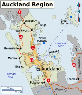 The Auckland Region is in the North Island of New Zealand. Centred on the Auckland metropolitan area, it also includes a large rural area, stretching as far north as the Wellsford district. The region includes ruggedly beautiful west coast beaches and harbours, the more sheltered inlets and beaches of the east coast, the islands of the Hauraki Gulf and the hiking trails of the native bush-clad Waitakere and Hunua ranges.
