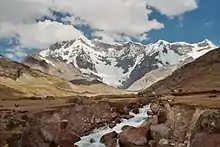 Follow a good dirt road that twists across the river and round the hills up from Tinqui. Passing motorcyclists will likely try to sell you a ride further uphill. Although the first few hours’ walk is approach through farmland without much to see, it is unwise to accept their offers unless you are very well acclimated; otherwise you risk gaining over 1000 m in less than a day. Walk past a very small town, Upis, and continue left up through the hills, as the farmhouses become scarcer and further apart. The road eventually levels out, with decent campsites; soon after, turn right and follow a faint trail for a few kilometers across the edge of a broad, marshy valley until you hit a small outpost with horses and a few buildings; this is Upis Alto, with primitive bathrooms and even more primitive lodging (from S/10). The owners speak Spanish and Quechua only and are somewhat taciturn, but may rent packhorse or even hire a guide depending on their availability or mood (from S/30-50/day).