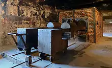 • 🌍 Auschwitz I. The first camp to be used (therefore called Stammlager, 'main camp' in German). It is in a far more complete state than Birkenau, but is also much smaller. The camp consists of former Polish military barracks, which were requisitioned by the Nazis in 1940. Near the entrance, you will see the wrought iron gate bearing the infamous and mocking camp slogan, Arbeit macht frei - "work sets you free." Inside some of them you will find information material, boards, photos and personal belongings to illustrate the life and cruelties of this camp. The only remaining gas chamber is here. As indicated in the chamber, it was reconstructed to its wartime layout after the war. Other sights include solitary confinement cells used as punishment, the death wall memorial where several thousands of people were shot by firing squad, and a reconstruction of the gallows used in 1947 to execute camp commandant Rudolf Höss, on the site of the camp's Gestapo office.