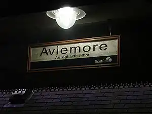 Aviemore (Gaelic: An Aghaidh Mhòr) is a town in the Spey Valley of Highland Scotland. It's the main base for skiing and other outdoor activities in Cairngorms National Park. It's the largest of a straggle of villages including Rothiemurcus and Coylumbridge, also described here, and in 2020 had a population of 3230.