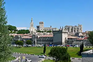 Then, in medieval times, the town grew to an important center of communication and trade. The stone bridge spanning the Rhone was one of only three between the Mediterranean and Lyon. It was undoubtedly for its strategic location and ease of travel that it was chosen by the papacy as home within the then kingdom of Provence. The presence of the papacy made Avignon into a city of great political and economic activity. The old city wall, now visible only as a street that circles the centre of the town (changing names 5 times in the process!) was much too small and a larger wall, still visible today, was necessary to protect its bulging population. Wealthy Cardinals built extravagant palaces known as livrées both within Avignon and across the river, in Villeneuve-lès-Avignon.