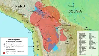 Aymara is the language of the Aymara people in the Andes. It has over 2.5 million speakers, in the country of Bolivia (official language), Chile, Argentina and Peru (official language).