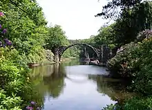- 🌍 Azalea and Rhododendron park Kromlau (Azaleen- und Rhododendronpark) (6 km west of Bad Muskau; 300 m from the forest railway station Kromlau). A landscape garden of nearly 81 ha, created by landowner Friedrich Hermann Rötschke—a contemporary of Prince Hermann von Pückler—starting in 1844. He directed the planting of both domestic and exotic plants as well as the arranging of artificial rock formations and landscape sculptures (like caves, grottos, pyramids) made of basalt from Saxon Switzerland and Bohemia. After Count Egloffstein-Arklitten acquired the park in 1893, he hired landscape gardener Georg Eichler to redesign the park with rhododendrons and azalea that still dominate the park's flora. The park includes a 18th-century mansion and the very picturesque Rakotz bridge (colloquially called "devil's bridge").