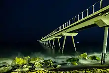 - 🌍 Pont del Petroli (Oil Bridge). Built as a dock for unloading oil products from ships. Renovated in 2009, it is now a dock for citizens' and scientific use. A wide panoramic view of Badalona's (and Barcelona's) coast can be seen from the far-end of the dock. A weather station is also located there. A popular spot for maritime walks, couples and fishermen at night. A statue of Anís del Mono (an ape with Darwin's face, holding a bottle of Anís del Mono) is located at the dock's entrance.