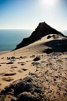 Bahia de Kino's sandy beach is one of the town's attractions. The beach is easily accessed every block via public access ways. To the south of town is the Santa Cruz estuary/lagoon then the coastline veers to the west to Punta San Nicolas. To the north west of town the coast is an interesting mix of rocky headlands and sand/gravel coves. Views of Isla Tiburon to the west abound. Interesting peaks with magnificent views all the way across to Baja dominate the landscape to the east and north. To the south flat desert scrubland continues all the way southeast to Estero Tastiota about 64 km (40 miles) away.