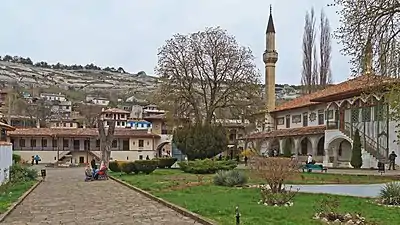 • 🌍 Khan's Palace (Crimean Tatar: Han Saray, Russian: Dvar-yets, Ukrainian: Palats), Ulitsa Lenina (in the center of the old town; Bus 2 runs from the train and bus station). In the summer, you can hire a guide in almost any language. Points of interest include the inner palace, the Kahn's cemetery, the Falcon Tower, the Crimean Tatar museum and a small art gallery. Behind the palace is a World War II military cemetery. Entrance to the grounds and mosque is free, fee for the palace interior and exhibitions..