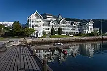 - 🌍 Kviknes Hotel, Kviknevegen 8, ☏ +47 57 69 42 00, fax: +47 57694201, booking@kviknes.no. A beautiful Swiss chalet-style hotel located right near the boat terminus. Over the years, a number of celebrities have stayed there. Excellent views of the fjord and mountains. Breakfast and dinner usually included.
