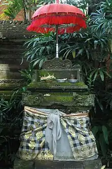 Balinese Hinduism diverged from the mainstream well over 500 years ago and is quite different from what you would see in India and the rest of South Asia. The primary deity is Sanghyang Widi Wasa (Acintya), the "all-in-one god" for which other gods like Vishnu (Wisnu) and Shiva (Civa) are merely manifestations, and instead of being shown directly, he is depicted by an empty throne wrapped in the distinctive poleng black-and-white chessboard pattern and protected by a ceremonial tedung umbrella.