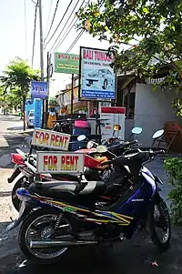 If you do make the effort to walk outside the airport to the street, you can also flag down a bemo (local minivan). Most of the bemos in this area will be heading to Kuta (the road to Kuta heads to the left looking out from the airport gate), but don't absolutely bank on it, and be prepared for a hot, crowded journey. It should cost no more than a few thousand rupiah per person (ask the driver beforehand). And if you are a lone backpacker you can try an ojek (unmetered motorcycle taxi) in the first intersection outside the airport (3 to 5 minutes walk), for less than half of a taxi meter fare. If you are not sure if a taxi can reach your hotel because of narrow streets, or you are unsure of your hotel's location, an ojek is a good option: they frequently take narrow streets as shortcuts, use pedestrian paths and sometimes go against traffic on theoretically one-way streets. An ojek to Kuta costs Rp10,000 to Rp15,000.