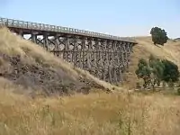 - 🌍 Scarsdale to Linton (12.9). This is the prettiest part of the trip, but also the hardest work. Just out of Scarsdale you will cross the 🌍 Nimmons Rail Bridge, a spectacular wooden trestle bridge, which has been restore so you can cycle over it, or use the track under it. After the bridge the track ascends through bushland, to an abandoned road bridge in the cutting, then you are rewarded with a cruise down through bushland and beside lakes and dams to Linton. Linton has a general store, milk bar, and petrol station for drinks and supplies right on the trail. If you ascend the hill into the town centre, you will find the pub, and not much else. Most of the rest of the town has all closed up.