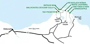 - Ulster Way is a long-distance hiking trail that circumnavigates Northern Ireland. The local section is called the "Causeway Coast Way" but in early 2021 is problematic, with no footpath between Carrick-a-Rede and Ballycastle, so you have to tramp along the busy main road with no sidewalk. To the east the route swings inland as Moyle Way, over boggy hills. In wet weather stick to the public road along the coast towards Cushendall.