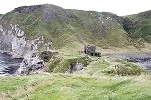 - ๐ Fair Head is a three-mile stretch of cliffs up to 300 ft / 100 m high. They're dolerite, rising in organ-pipe columns, popular for rock-climbing. They're not quite sea-cliffs as a scree separates them from the shore. By car or bike leave A2 Cushendall Rd at Ballytoy (Hunter's Bar) and follow Torr Road east. In the little lake by the car park is an Iron Age crannog. Wild goats roam the headland. From here on, the coast trends south, facing the Irish Sea.