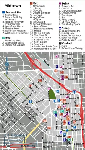 - π Peabody Court Hotel, 612 Cathedral St, β +1 410 727-7101. A really pretty old hotel, not-long-ago converted from apartments, right on beautiful Mount Vernon Square. The rooftop bar has a great view over the city. This is pretty straightforwardly the nicest large hotel in Midtown. $150-220.