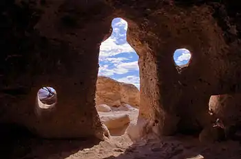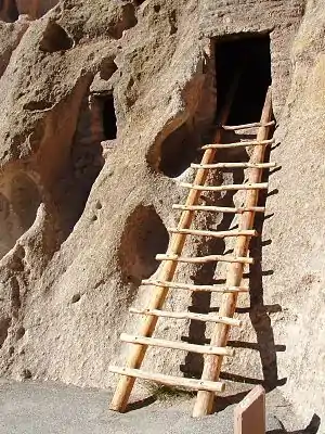 The 🌍 Visitor Center in Frijoles Canyon offers a multimedia show on the monument, and there is a small gallery containing artifacts of archaeological, historical and cultural interest. However, most of the attractions of the main area are outdoors. A one-mile (1.6-km) loop trail starts behind the visitor center and leads to a variety of restored ruins of lodgings and ceremonial kivas on the canyon's floor and north wall, with interpretive signs en route and numbered references to an explanatory pamphlet available by purchase or returnable with deposit at the visitor center. Much of this trail is paved and accessible to wheelchairs, but the section along the canyon wall is rougher and includes stairs. Wooden ladders afford (optional) access to some of the cliff dwellings created by ancient Puebloans who enlarged natural voids ("caves," although the structures have nothing to do with classical limestone caves) in the soft tuff of the canyon wall.