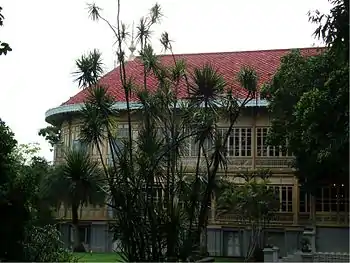 - 🌍 Vimanmek Mansion (พระที่นั่งวิมานเมฆ), ☏ +66 2 628-6300. Touted as the world's largest golden teak building, this palace was the home of King Rama V in the early 20th century. It was built as a summer retreat on the island of Ko Si Chang, but was transported to Bangkok in pieces in 1901. A guided tour is compulsory and tells you all about the life of King Rama V, and about his collection of fin de siecle royal memorabilia placed inside the building. As King Rama V tried to modernise Thailand along European lines, you can see the first Thai indoor bathroom, the first typewriter with Thai characters, and some of the first portrait paintings of Thailand.