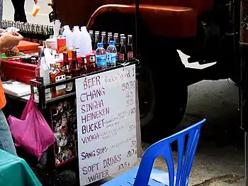 - 🌍 Suksabai (สุขสบาย เรสเทอรองด์), 96 Rambuttri Rd (opposite Viengtai Hotel), ☏ +66 2 629-0298. 24 hours. Suksabai is touted as a restaurant, and they have a large menu with Thai, grill and Italian dishes in the 80-130 baht price range. While decent for budget travellers, the real attraction of this place is its outdoors seating. Seats are lined up onto the main road every night, which makes it is a good place to hang out, talk and watch football on the big screens. Beer and cocktails here are slightly cheaper than on Khao San Road; a large Chang beer goes for 80 baht. It's best to only go inside for the toilet, as its interior is rather uninspiring and messy.