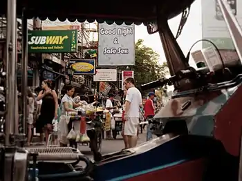 Khao San Road (Thai: ถนนข้าวสาร) is a small road about a block from the Chao Phraya River at the northern side of Rattanakosin. Backpackers and budget travellers are drawn here by some of the cheapest accommodation and travel deals in Thailand. This article also deals with the wider Banglamphu area that hosts a few interesting temples, and lots more places to stay and eat.