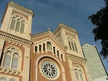 • 🌍 Assumption Cathedral (อาสนวิหารอัสสัมชัญ), 23 Soi Oriental (Oriental Pier or BTS Saphan Taksin), +66 2 233-7120. Daily. The Assumption Cathedral is the main Roman Catholic church of Bangkok. The original building at this place was the brainchild of French missionary Father Pascal in 1809, and completed in 1821. Throughout the second part of the 19th century, the area surrounding the church played an important role for French Christian missionaries arriving in Bangkok. It is near the Oriental Hotel and the French Embassy in an area that still captures somewhat of its French history. The current church dates from the 1910s, when the building was completely reconstructed in a Romanesque style. It was heavily damaged by bombing in World War II, but was restored after extensive repairs. Its rectangular structure and red brick exterior makes it stand out from the dull white surroundings. Its interior is spacious with a high ornate ceiling. Pope John Paul II visited the church in 1984, showing the prominence of the church in the Roman Catholic community of Thailand. The only religious service in English is held Sundays at 10:00. Free.