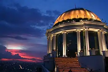 • 🌍 Sky Bar Bangkok (Riverview Rooftop Bar), 63F, State Tower, 1055/111 Silom Rd (BTS Saphan Taksin or Sathorn Pier), +66 2 624 9555. 18:00-01:00 daily. The world's tallest rooftop bar/restaurant, a few metres higher up than Vertigo — but due to its slightly off-centre location, the views are arguably not quite as stunning. It's a complex of a number of expensive restaurants, including the Mediterranean-flavoured Sirocco, but the cheapest option for just a drink is the outdoor Sky Bar, which has a jazz band most nights. Prices are steep with a beer at 300+ baht and cocktails 450+ baht.