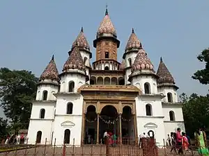 - 🌍 Hangseshwari Temple (হংসেশ্বরী মন্দির Haṁseśbarī Mandir). A Hindu temple dedicated to Hangseshwari, a form of Goddess Kali and an incarnation of Devi. It was built between 1799 and 1814. The temple has a distinctive architecture different from the usual pattern present in this area, consisting 13 minars or Ratnas, each built as a blooming lotus bud. The inner structure of the building resembles human anatomy.