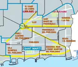 The Sant Martí district is administratively divided into 10 boroughs, each with a slightly different character. Areas of interest to the tourists are generally south of the Diagonal. The barris south of Diagonal are (from West to East):