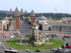 - 🌍 Plaça d'Espanya. Placa d'Espanya was created for the 1929 World Exhibition, on a site once used for public hangings. The fountain in the center of the square is a great attraction and plays music during the summer. Plaça Espanya is located at the base of Montjuic hill.