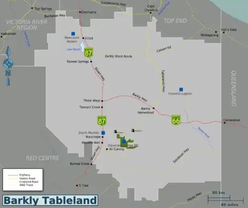 Although Barkly Tableland is one of the remotest places in Australia, it is quite easy to get in with a 2-wheel-drive-car using sealed roads. The Stuart Highway (Highway 87) is a sealed road that crosses the region from north to south, and your best bet if coming in from Darwin, Katherine or Alice Springs. Incoming traffic from Queensland goes via the Barkly Highway (Highway 66), another sealed road in perfect condition both with a good 130 km/h (81 mph) limit. Even while using these quality roads, you are still in the middle of the Outback, so get plenty of fuel, drinks and food on board and make sure your car is in top condition.