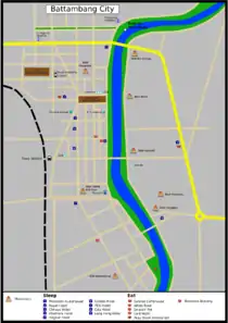 Battambang (Khmer: ក្រុងបាត់ដំបង) with about 150,000 people (2016), is Cambodia's second most populous city, and a popular tourist destination due to the nearby ancient temples, the circus and the bamboo railway. It is the capital of Battambang Province.