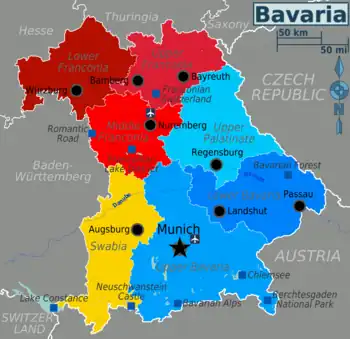 Bavaria (German: Bayern) is the largest federal state (Bundesland) of Germany, situated in the south-east of the country. It extends from the middle German hills down into the Alps. Bavarian folk culture has shaped many non-Germans' view of Germany, though ironically, much of Bavaria has more in common culturally with its southern neighbours Austria and Switzerland, than with the rest of Germany. Stereotypes about Bavaria include leather trousers (Lederhosen), sausages and lots of beer - however, the state has much more to offer to the traveller. Along with the Rheinland and Berlin, it is Germany's most popular tourist destination, so expect long lines and high prices, especially in summer and in ski resorts in winter.