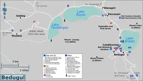This article covers the Bedugul area as well as the village of Munduk to the west, and areas between Bedugul and Mount Batukaru to the south west. Mount Batukaru itself is covered in the Tabanan article.