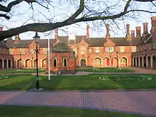 Among the most notable buildings in Bedworth are the Nicholas Chamberlaine Almshouses on All Saints' Square in the town centre, which are built in Tudor style and date from 1840. They replaced the original buildings which had been funded by a legacy from the local benefactor Nicholas Chamberlaine (1632–1715) through his will. The almshouses were restored in the 1980s, and are now Grade II* listed.