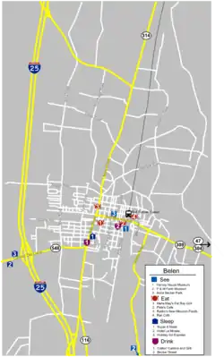 Main Street is the principal north-south street through Belen, connecting to the two I-25 exits on both ends of town. Traveling further in either direction, Main Street becomes a state highway running parallel to I-25. Reinken Avenue is the main east-west road through Belen, starting at Main Street and running east over the railyard, crossing the Rio Grande, and ending at a north-south state highway connecting to places across the Rio Grande.