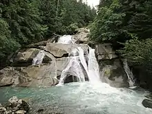 - 🌍 Clayton Falls Recreation Site (continue on Hwy 20 past the ferry wharf for about 3 km to the sign for the recreation site; the parking lot is on the north side of the road). An impressive amount of beauty packed into a small area. From the parking lot, it's a short walk to picnic tables with a stunning view of the mountains and North Bentinck Arm. The falls are visible from a short trail next to the hydro sub-station.