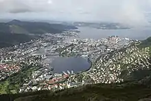 Bergen is a sprawling city stretching some 40-50 km in either direction where the 286,000 inhabitants (2021) are separated by mountains, fjords and lakes. Only the central parts are visible from the panorama points at Mount Fløyen. The distant parts of the city are mostly of less interest to the visitor. The city centre is on the other hand compact and can be covered by walking for most visitors. Bergen is facing the ocean and coast, and the hinterland is relatively sparsely populated. Bergen is separated from eastern Norway by crooked fjords and wide, inhospitable mountain areas, and until the Bergen railway was built in 1909 the most practical transport east-west was several days sailing around the coast.