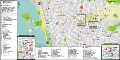 - 🌍 Berkeley Marina and Pier, 201 University Ave (at the west end of University Avenue, near Interstate 80), ☏ +1 510-981-6740, marina@cityofberkeley.info. M-Sa 8AM-4PM. From the pier, you get great views of San Francisco, the Golden Gate Bridge, and the Bay. Local Fisherpersons cast for their dinner, and if you're lucky you might see one catch a skate. Not recommended at night, as there's no light, not much to see, and if you run into a police officer, they'll think you're either lost or involved in suspicious activity.