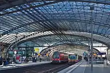 From Terminal 1: The building that houses Terminal 1 also houses the annex Terminal 2 used by some low-cost carriers and will house Terminals 3 and 4. It is served by 🌍 Berlin Brandenburg Airport railway station.. As Terminal 1 is served by more airlines and by higher prestige full service carriers, there is a bigger assortment of transportation options. There is a "Flughafen-Express" (FEX) or Airport Express to Berlin Main Station (Hbf) via Ostkreuz and Gesundbrunnen which is the fastest option to the main station from the airport. There are also several long-distance IC lines going to destinations like Dresden or Rostock - they also stop at the main station but cannot be used with an ABC ticket. After having served the Terminal 5 station, S9 and S45 also stop at the terminal 1 station (though they serve one intermediate station in between). Bus X7 also serves Terminal 1.