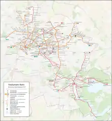 Berlin's U-Bahn and S-Bahn bear the scars of decades of partition and of post-reunification lack of funds. They originated as a hodgepodge of lines with different loading gauges constructed by private companies and then-independent cities. Routes are indicated by number and the name of their endpoint, so memorise them lest you want to go many kilometres in the wrong direction. A good public transport map comes in handy, and several institutions hand out city maps with urban rail stops indicated on them. The U-Bahn, S-Bahn and, in the former East, Straßenbahn (tramway) are still a good way to get around. The buses are also clean, reliable and relatively fast.