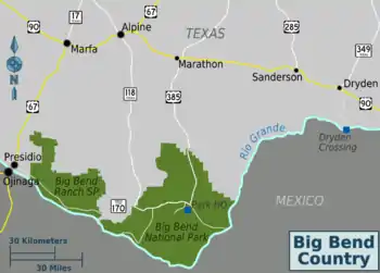 • Big Bend Ranch State Park, a sister park just next door that's somehow even more rugged and remote. Offers hiking, backcountry camping, off-road tours, the Barton Warnock Environmental Education Center, and a spectacular drive down Ranch Road 170 ("El Camino del Rio"). From the west entrance, drive north on TX-118 until you see the Ranch Road 170 turn-off on the left after a few miles (well-marked).