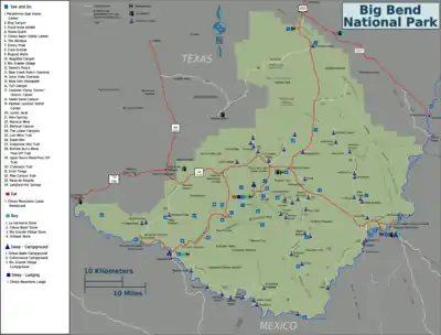 • TX-118 south from Alpine. This is the quickest route from the west. There is a bit more development along this stretch compared to the Marathon route but they are equally scenic. The small communities of Study Butte-Terlingua lie near the end of the route. Shortly afterward, the west entrance to the park is reached at Maverick Junction about 75 mi (121 km) to this point, then another 25 mi (40 km) east to park headquarters.