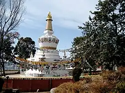 Bir is a small mountain town in northern Himachal Pradesh with a large, well-established Tibetan community. Set against the backdrop of the Dhauladhar Range of the Indian Himalayas, the town is picturesque, although the rubbish-strewn roadsides and waterways of the Tibetan Colony (down the hill from Bir proper) are an unfortunate contrast to its golden roofed temples, and to the greenery of Upper Bir (Bir Proper) and the surrounding villages. The Tibetan Colony is actually in the village of Chowgan. Bir proper, sometimes referred to as "Indian Bir" or "Upper Bir", is the small market and surrounding farming community located in the foothills above Chowgan.