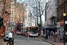 Intercity buses, unless clearly stated otherwise, will terminate at 🌍 Birmingham Coach Station. The City Centre is around a 10-minute uphill walk from the station along the slightly tatty Digbeth High Street, but people need not be alarmed as the Selfridges Building and skyline are clearly visible to guide you in the correct direction. some tickets include a free bus journey transfer to the city centre, on local public transport services. If you arrive at night (or have large amounts of luggage), consider getting a bus or taxi as the Digbeth area is not a very pleasant part of the city and is home to many pubs and other nightlife, which may intimidate strangers.