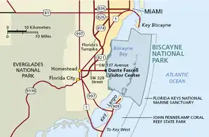 - Dante Fascell Visitor Center, +1 305-230-1100. 9AM-5PM. A gift shop sells T-shirts and other souvenirs. A bookstore, operated by the South Florida National Parks Association, sells various educational items. Proceeds support educational and scientific endeavors in South Florida's four national park areas.