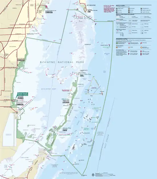 - Fishing and boating Anglers and boaters can launch their own boats from county-operated marinas adjacent to the park to venture into Biscayne Bay and to explore offshore coral reefs. Stop at the visitor center for regulations and to purchase nautical charts. For any boats docked after 6PM, a $15 overnight docking fee is charged at Boca Chita and Elliott Key harbors.
